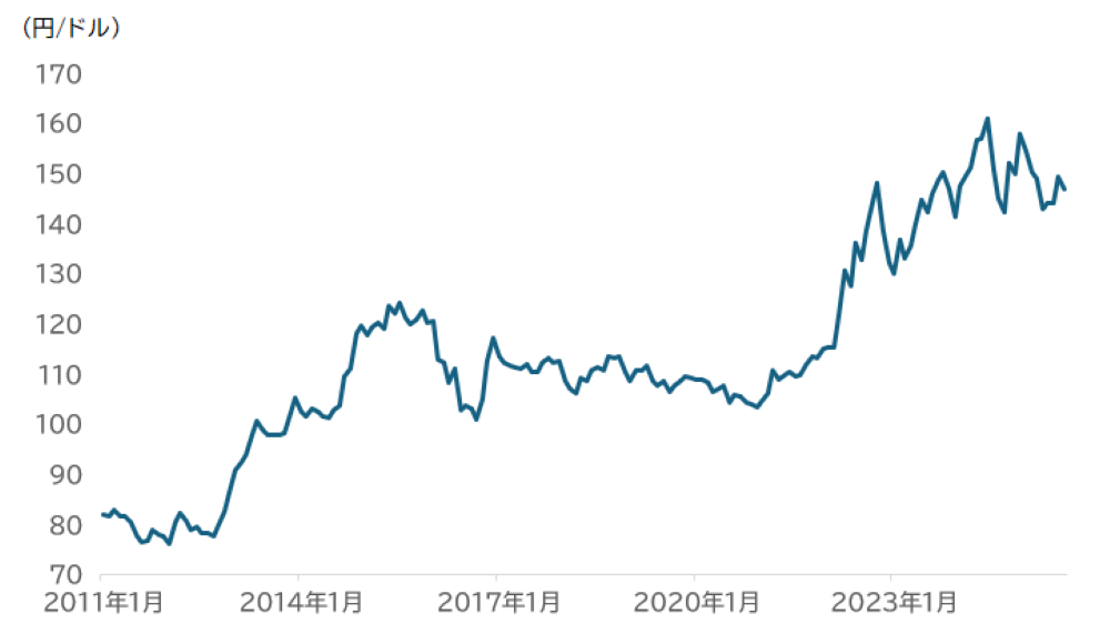 一時期1ドル160円台に達した水準からは調整が見られるものの、米ドル/円の為替レートは長期的に見れば円安水準にあります。